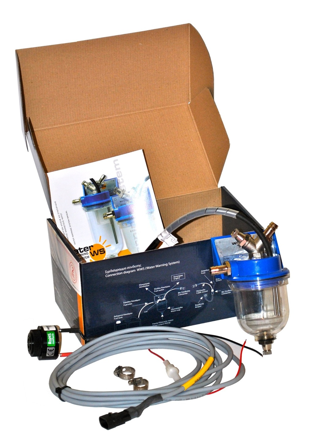 The Water Warning System, model S1-200, is comprised of the main unit - a water-trap with a built-in electronic circuit, sensors for detecting the presence of water, a double-signal (red and green) LED located on the upper part of the unit, as well as fuel inlet and outlet fittings. Featuring two valves, one for quick and easy extraction of the trapped water and the other for ventilation, speeding up the process of water removal when it is detected. The rest of the hardware (wiring, beeper and two metal clamps) can be found right out-of-the-box.