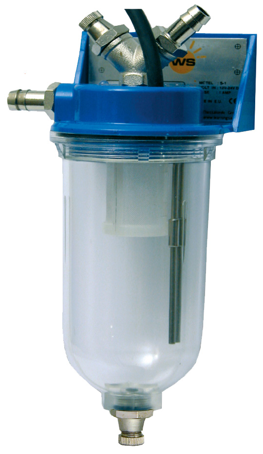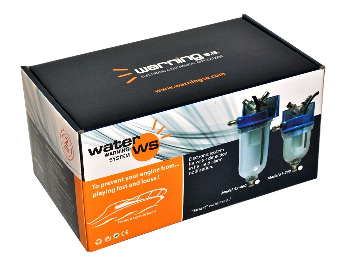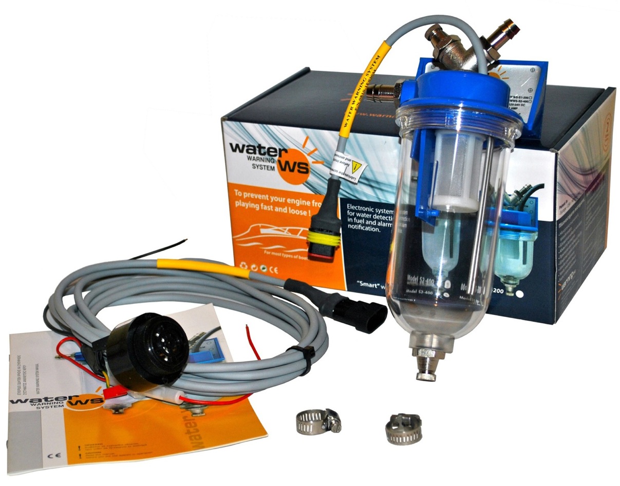 The Water Warning System, model S2-400, is comprised of the main unit - a water-trap with a built-in electronic circuit, sensors for detecting the presence of water, a double-signal (red and green) LED located on the upper part of the unit, as well as fuel inlet and outlet fittings. Featuring two valves, one for quick and easy extraction of the trapped water and the other for ventilation, speeding up the process of water removal when it is detected. The rest of the hardware (wiring, beeper and two metal clamps) can be found right out-of-the-box.